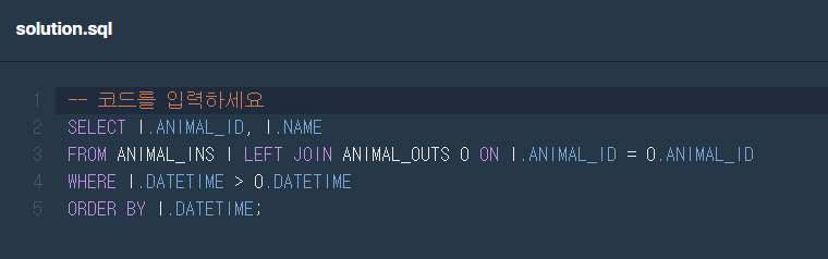 ANIMAL_INS.DATETIME > ANIMAL_OUTS.DATETIME를 해줘야 결과가 제대로 나온다.