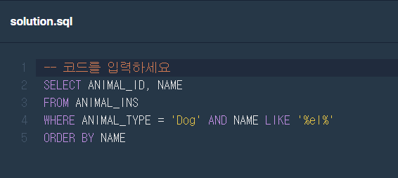 문제 | 보호소에 돌아가신 할머니가 기르던 개를 찾는 사람이 찾아왔습니다. 이 사람이 말하길 할머니가 기르던 개는 이름에 'el'이 들어간다고 합니다. 동물 보호소에 들어온 동물 이름 중, 이름에 EL이 들어가는 개의 아이디와 이름을 조회하는 SQL문을 작성해주세요. 이때 결과는 이름 순으로 조회해주세요. 단, 이름의 대소문자는 구분하지 않습니다.
